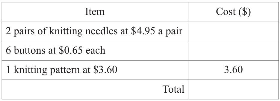 (a) Knitting needles: 2 × \$4.95 = \$9.90