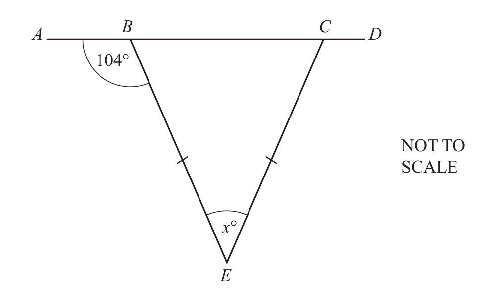 In triangle BCE, x = (180° – 76°)/2 = 28°.