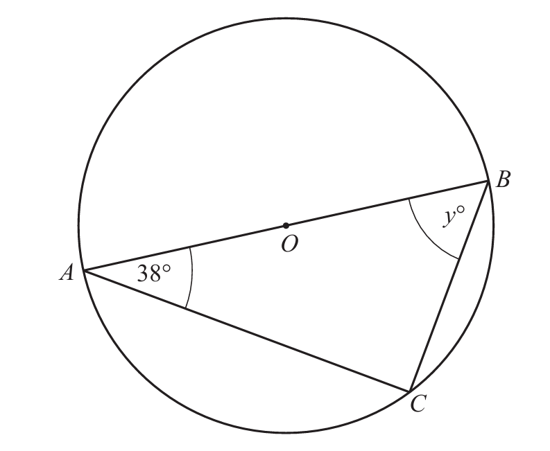So y = 180° – 90° – 38° = 52°.