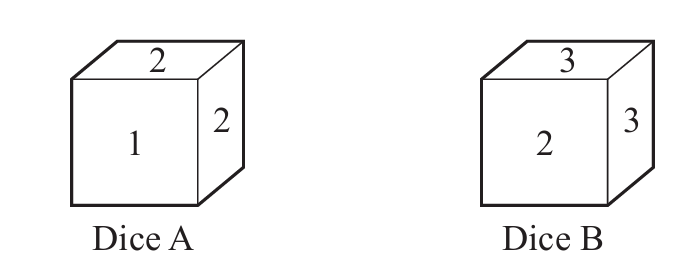 Dice B is numbered 2, 3, 3, 4, 4, 4.