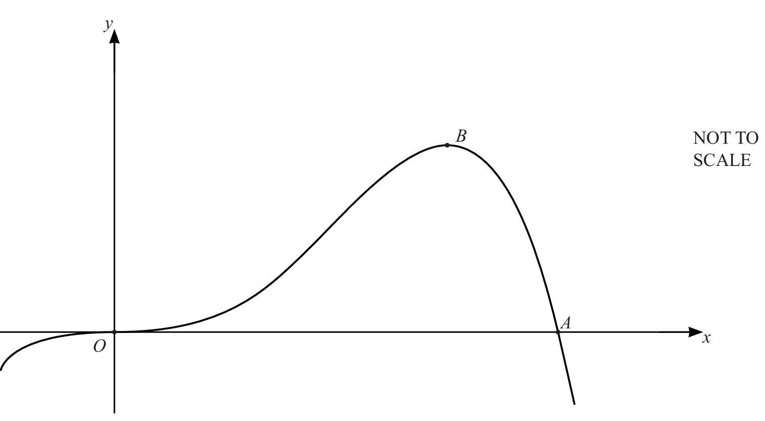 The graph crosses the \( x \)-axis at the origin \( O \) and at the point \( A \).
