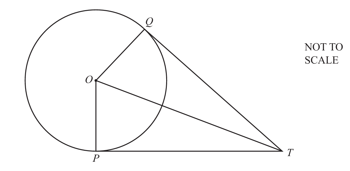 Angle OPT = angle OQT = 90° because tangent is perpendicular to radius.