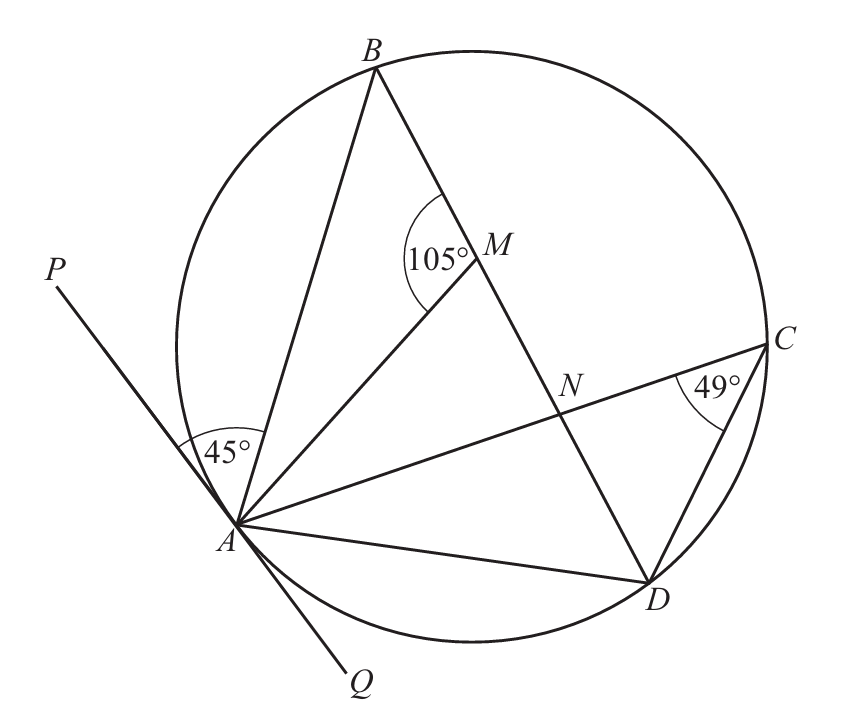 Angle \( ACD = 49^\circ \), angle \( AMB = 105^\circ \) and angle \( PAB = 45^\circ \).