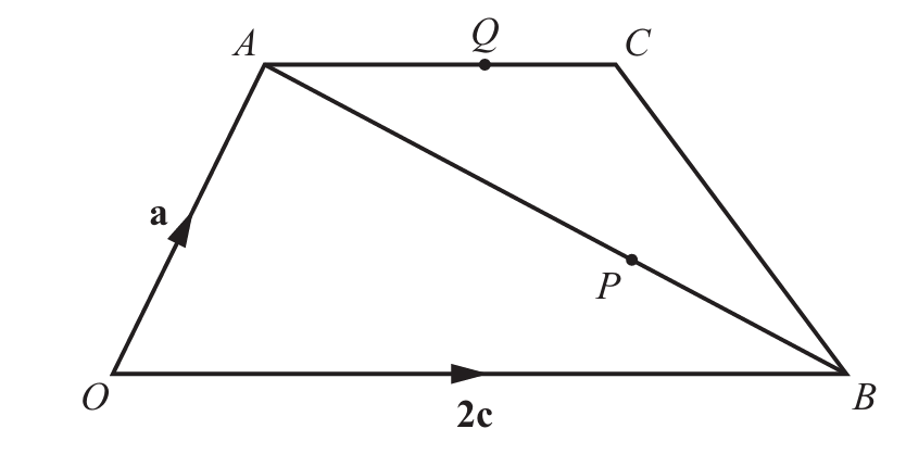 AB is the vector from A to B, which is OB – OA = \(2\mathbf{c} – \mathbf{a}\).