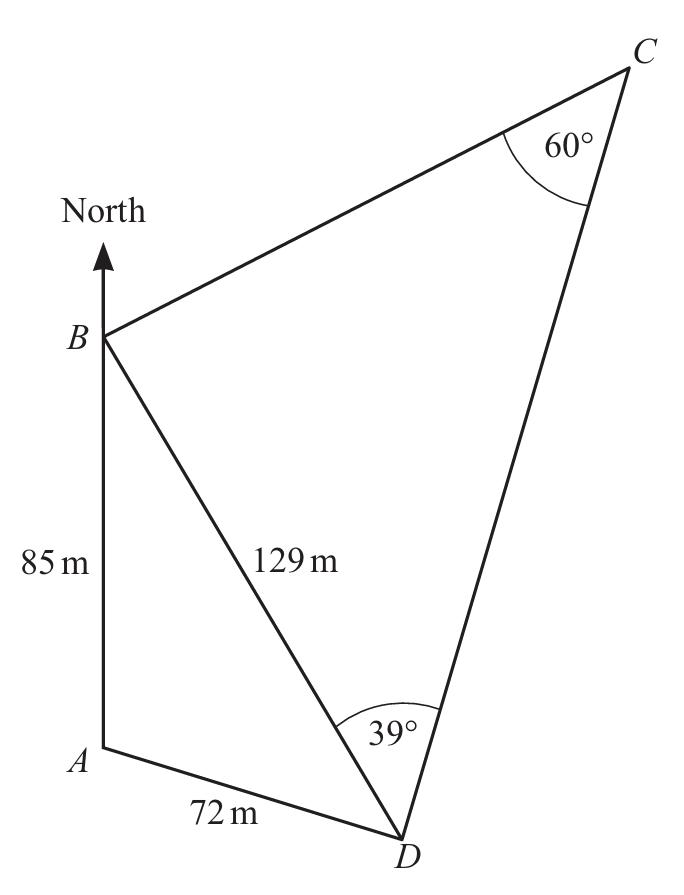 AB = 85 m, AD = 72 m, BD = 129 m, angle BDC = 39° and angle BCD = 60°.