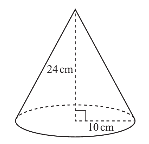 The diagram shows a solid cone with base radius 10 cm and height 24 cm.