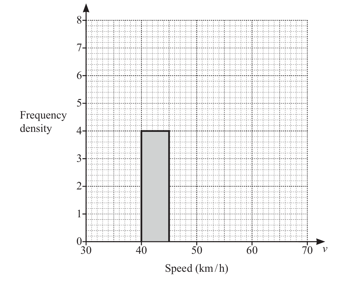 Frequency densities: 1.5 (30-40), 4 (40-45), 7 (45-50), 1.5 (50-70). Widths represent class intervals, heights represent frequency density (frequency/class width).