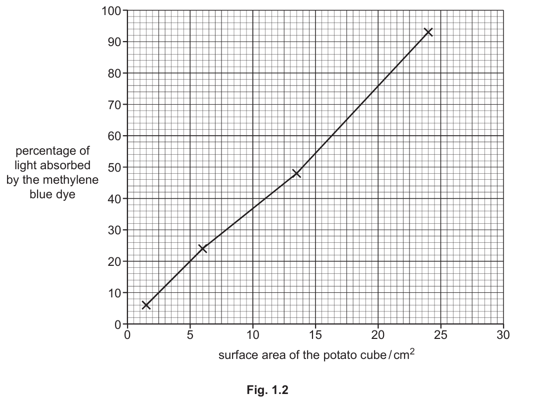 Using Fig. 1.2, estimate the percentage of light absorbed by the methylene blue dye when the surface area of the potato cube is 18 cm². Show on Fig. 1.2 how you obtained your estimate.
