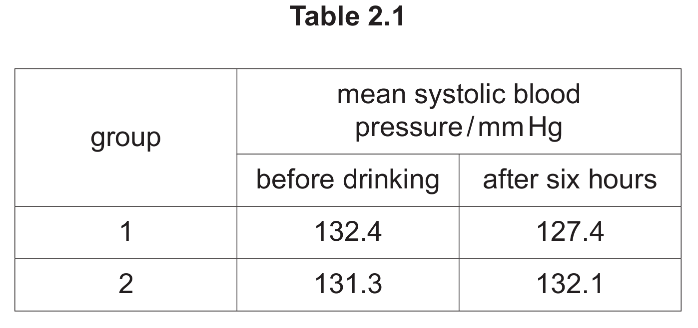 (c) Scientists wanted to find out if drinking beetroot juice lowers blood pressure. Two groups of men had their systolic blood pressure measured. Group 1 drank 500 cm³ of beetroot juice and group 2 drank 500 cm³ of apple juice. After six hours their systolic blood pressures were measured again. The results are shown in Table 2.1.