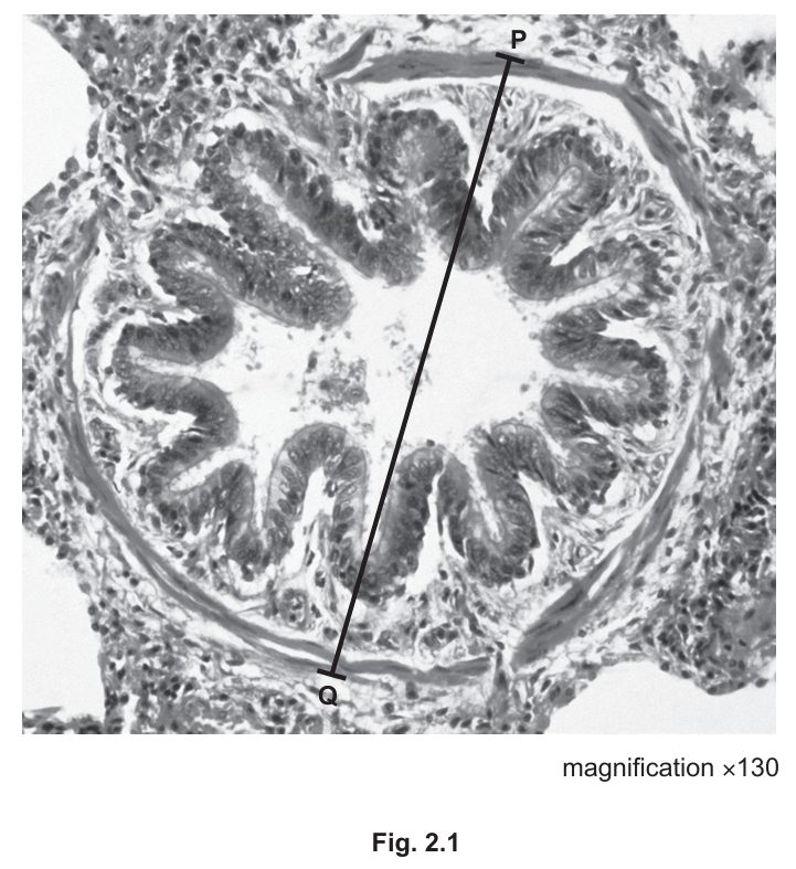 (i) Line PQ represents the width of the bronchiole. Measure the length of line PQ in Fig. 2.1. Calculate the actual width of the bronchiole using the formula and your measurement. Give your answer to two significant figures.