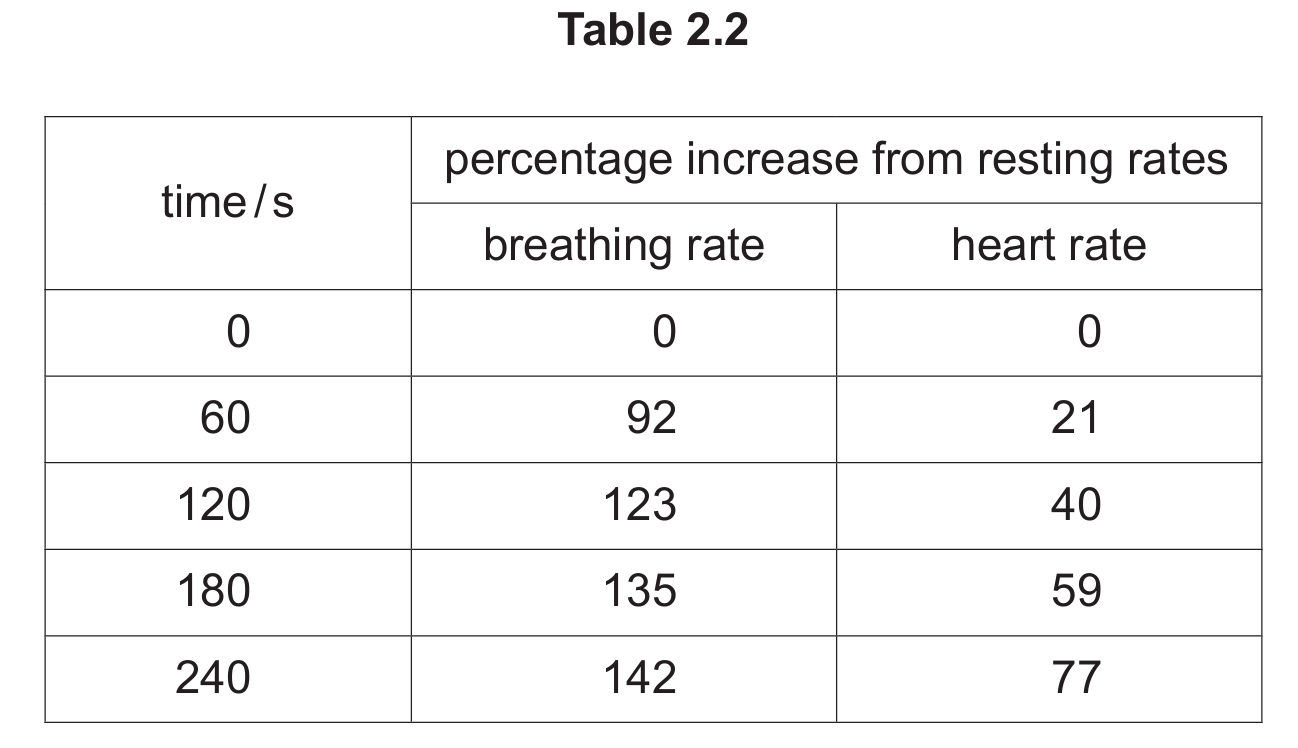 (e) A scientist investigated the effect of exercise on breathing rate and heart rate while running. They measured the percentage increase in breathing rate and heart rate from the resting rates during a four-minute run. The results are shown in Table 2.2.