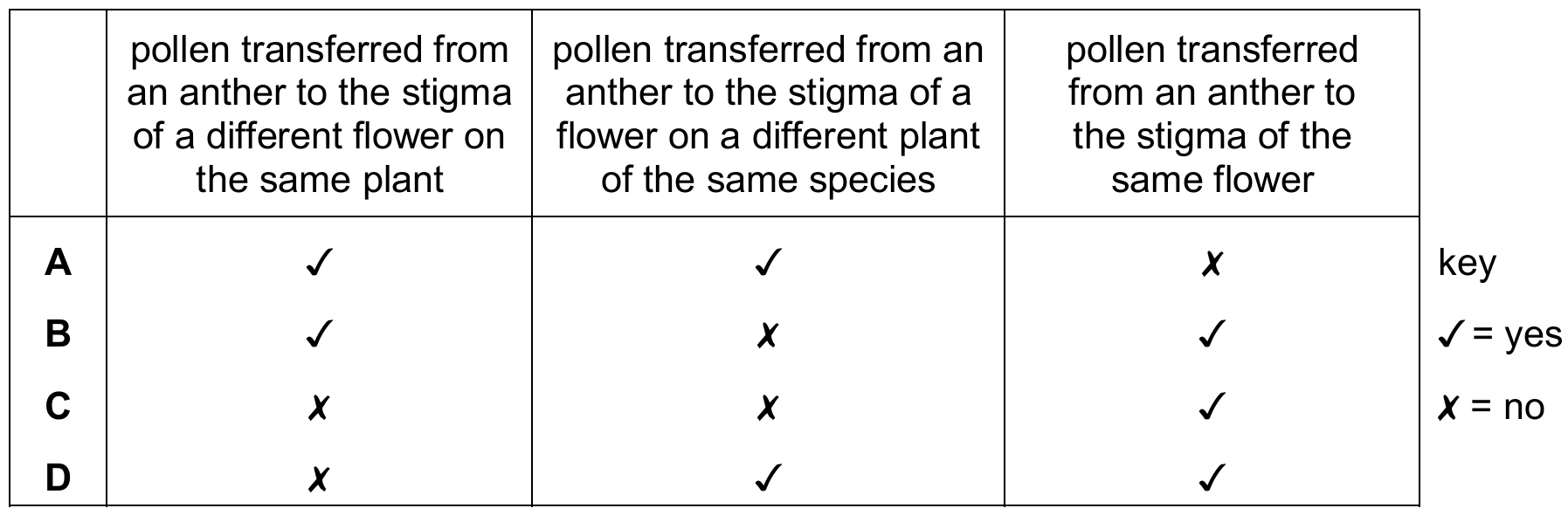 Self-pollination occurs when pollen from the anther is deposited on the stigma of the same flower or another flower on the same plant. Because the genetic material comes from the same individual, it is considered “selfing.” In contrast, cross-pollination involves the transfer of pollen to a flower on a different plant of the same species. Therefore, a row describing self-pollination must have a “yes” (✓) for transfers within the same flower and between different flowers on the same plant, but a “no” (✗) for transfers to different plants.