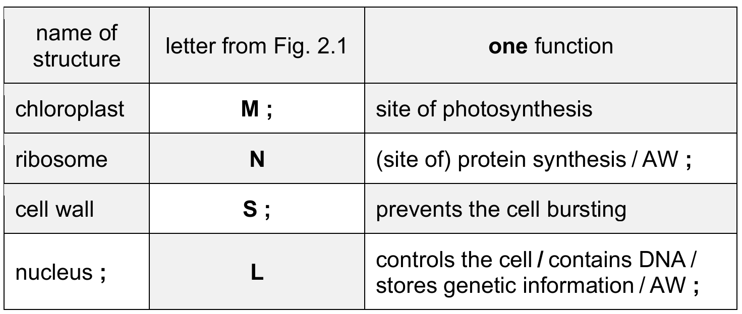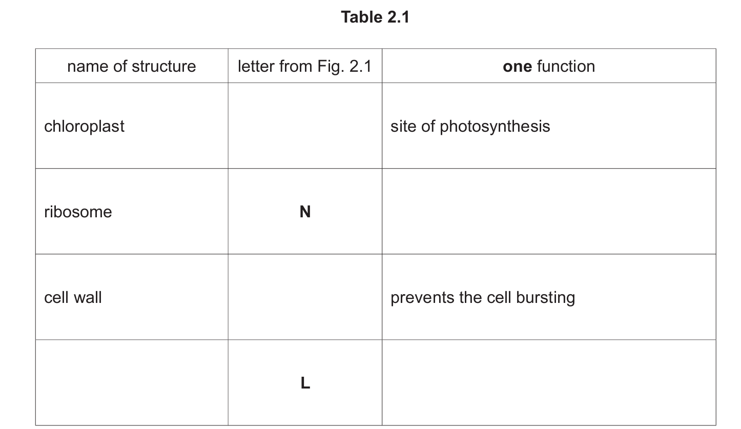 Table 2.1 shows the names of some plant cell structures, their functions and the letters that identify them in Fig. 2.1.