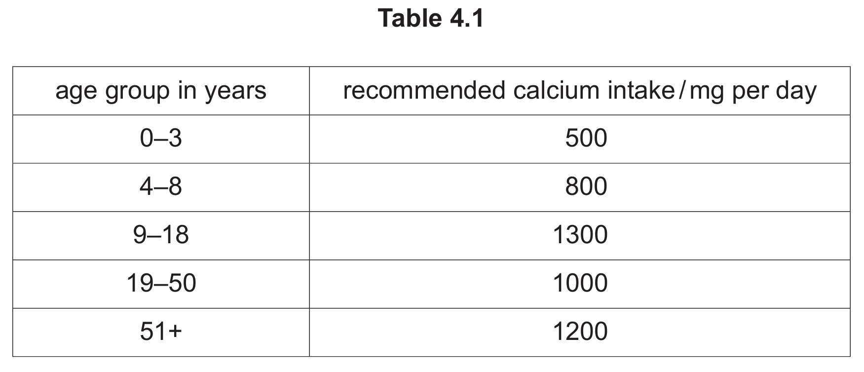 (ii) Table 4.1 shows the recommended calcium intake for different age groups.