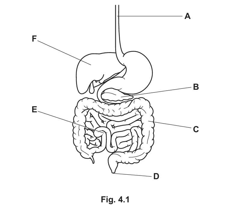 (ii) State the two letters from Fig. 4.1 that label the parts of the digestive system where water is absorbed.