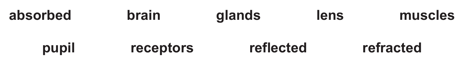 Rays of light reach the front of the eye. Light is …… through the cornea and the …… focuses light on the retina. Light …… in the retina detect light and the optic nerve carries impulses to the …… .