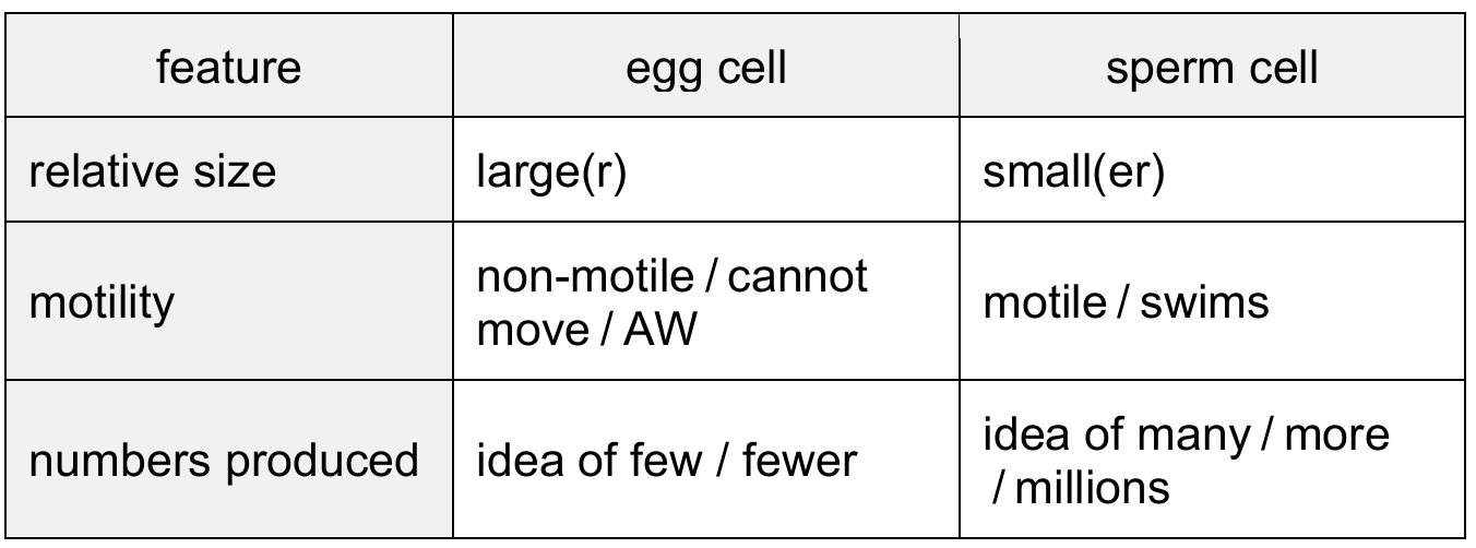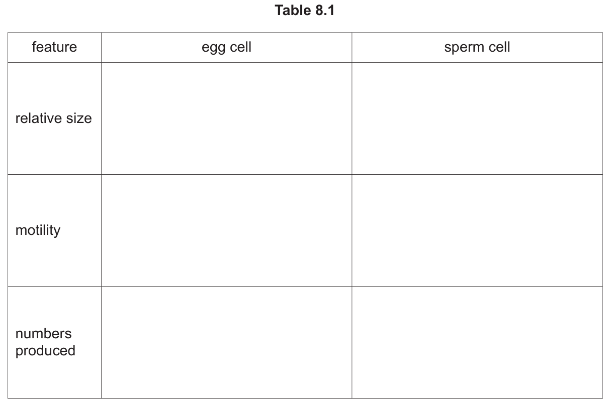 Complete Table 8.1 by stating the differences between egg cell and sperm cell size, motility and numbers produced.