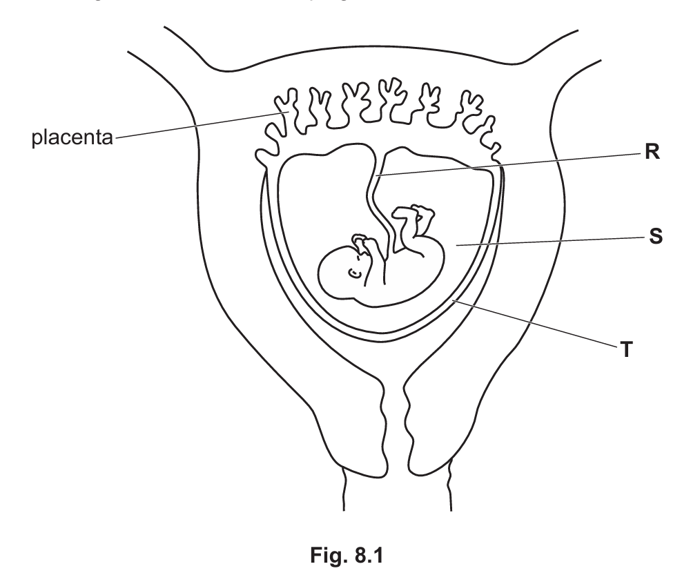 (d) Fig. 8.1 is a diagram of a fetus developing in a uterus.