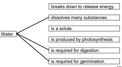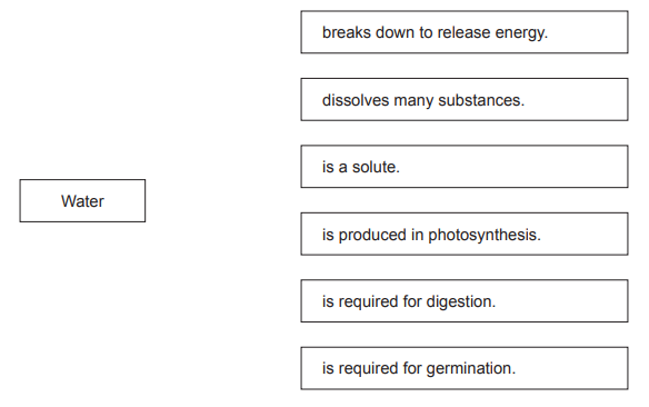 (a) Water is an important biological molecule. The box on the left contains the word ‘Water’. The boxes on the right contain some sentence endings.