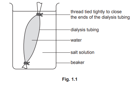 (b) Students investigated the movement of water in model animal cells using dialysis tubing. Fig. 1.1 is a diagram of the apparatus used in the investigation.