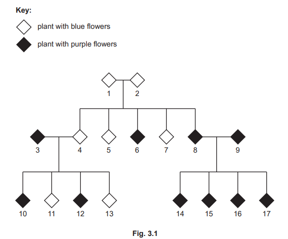 Fig. 3.1 is a pedigree diagram for a plant that can have either blue flowers or purple flowers. Blue flower colour is dominant to purple flower colour.