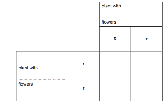 (b) A different type of plant can produce red flowers or white flowers. The allele for red flowers is dominant and is represented by the letter R. The allele for white flowers is recessive and is represented by the letter r. Two plants were crossed. Complete the Punnett square by writing in: