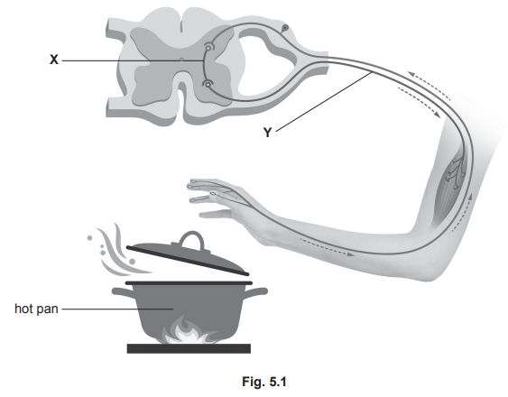 Complete the sentences about the reflex arc. The hot pan shown in Fig. 5.1 is the ………… in this reflex arc. The arrows shown in Fig. 5.1 represent the movement of an electrical ………. along the neurones. X is a ……… neurone and Y is a ……….. neurone. A junction between two neurones is called a …… .