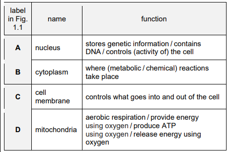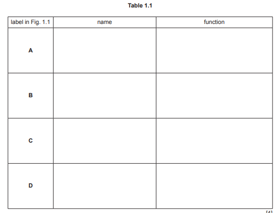 (a) Complete Table 1.1 by writing the name and function of each of the labelled parts of the cell shown in Fig. 1.1.
