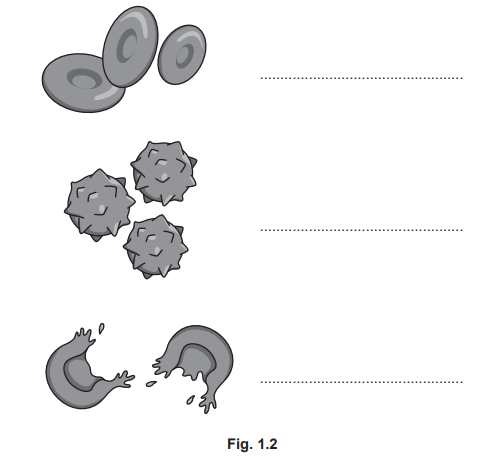 Fig. 1.2 shows the appearance of the red blood cells when examined using a microscope. Identify the liquids the red blood cells were immersed in. Write your answers in the spaces provided in Fig. 1.2.