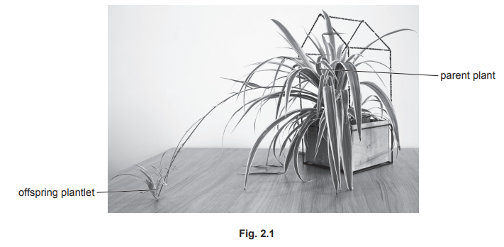 Fig. 2.1 is a photograph of a spider plant, Chlorophytum comosum. Spider plants can reproduce by producing an identical plantlet, which grows away from the single parent plant.