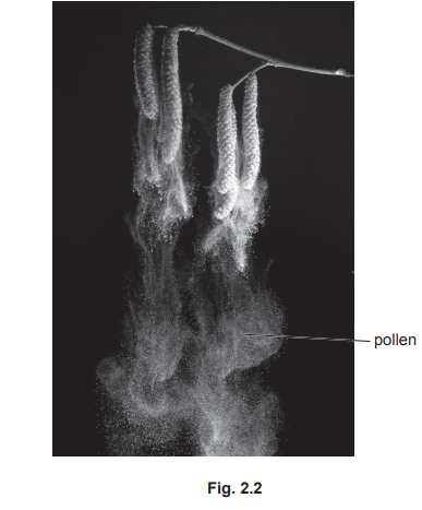 (b) Fig. 2.2 shows pollen that has been released from the flowers of a hazel tree, Corylus avellana. These flowers are wind‑pollinated.