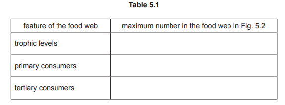(iii) Table 5.1 describes features of the food web in Fig. 5.2. Complete Table 5.1, using the information in Fig. 5.2