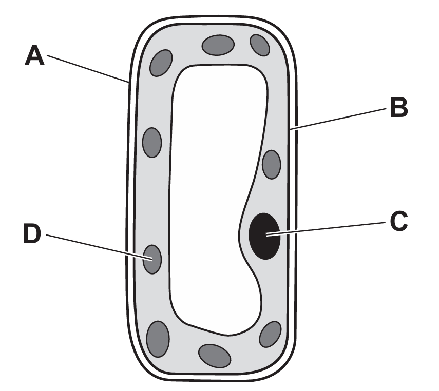 Which letter identifies where photosynthesis occurs in the cell?