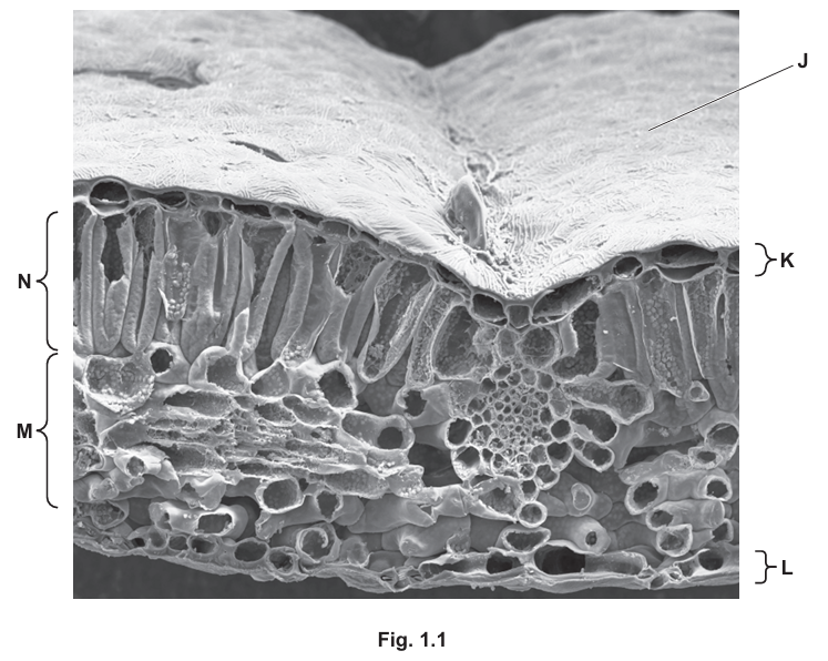 (a)(i) Gas exchange is controlled by L (stomata). Most photosynthesis occurs in N (palisade mesophyll). Spongy mesophyll cells are found in M.