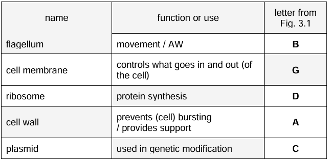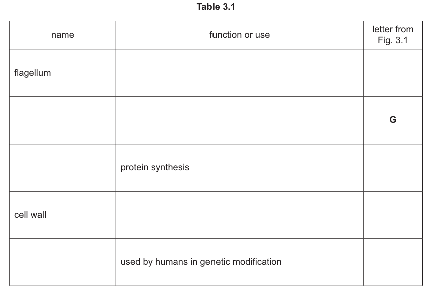 (a)(ii) Table 3.1 shows some of the names, functions or uses, and identifying letters of the parts labelled in Fig. 3.1.