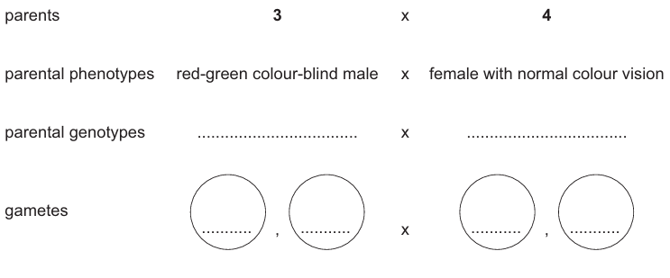 (b) Parent 4 is heterozygous for red-green colour blindness. Complete the genetic diagram to determine the probability that the offspring of parent 3 and parent 4 would be colour-blind.
