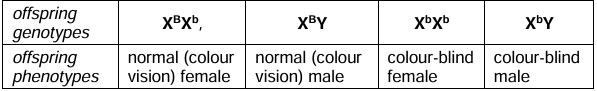 – 50% chance for sons to be colour-blind (\(X^bY\)).