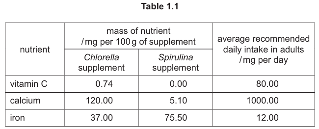 Table 1.1 shows some nutritional information for Chlorella and Spirulina supplements and the recommended daily intake for some nutrients.