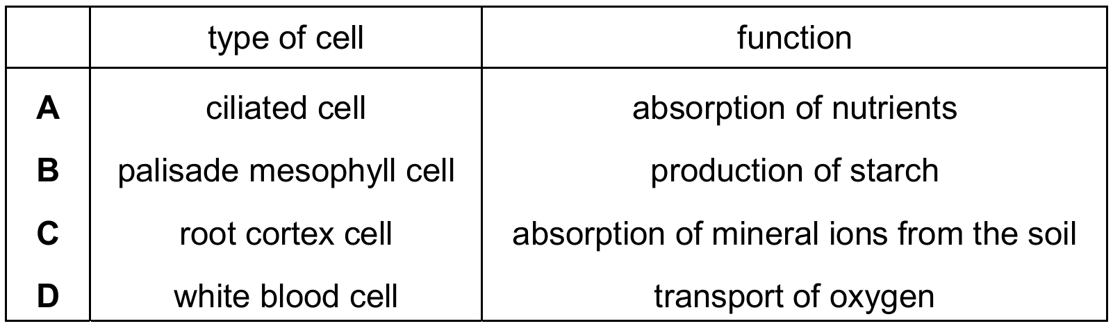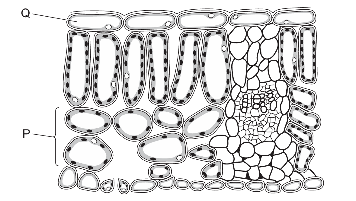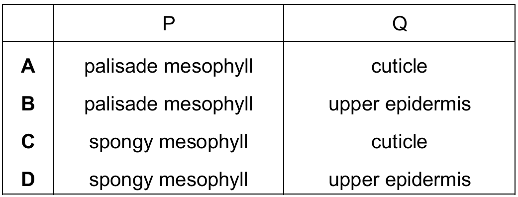 In the standard leaf cross-section diagram, cell Q is located at the top, within the upper epidermis. The tissue directly below it, P, shows irregular, loosely packed cells with large air spaces, which is characteristic of spongy mesophyll. The cuticle is a non-cellular layer, not a tissue that contains cells.