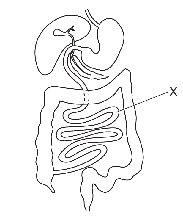 Part X is the small intestine. Its primary function is the absorption of digested nutrients (e.g., glucose, amino acids, fatty acids) into the bloodstream. Ingestion occurs in the mouth, egestion involves the removal of undigested waste via the anus, and excretion is performed by the kidneys and lungs.