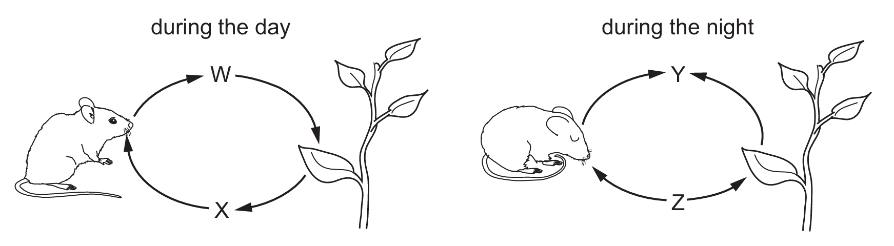 - During the night, when photosynthesis stops but respiration continues, \(\mathrm{CO_2}\) is released (represented by arrow Y)