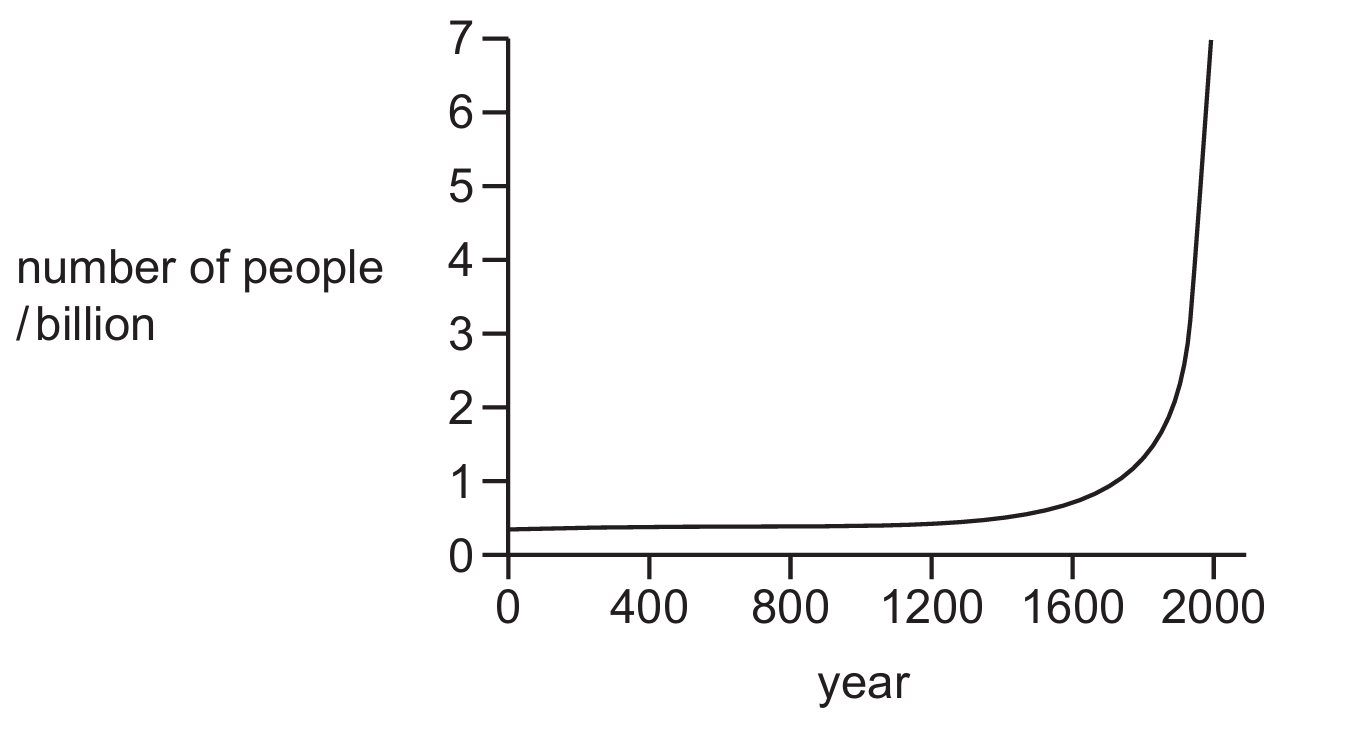 The period from 1600 to 2000 shows a rapid, accelerating increase in human population. This pattern is characteristic of exponential growth, where the growth rate becomes proportional to the current population size. In population biology, this is known as the exponential (log) phase.