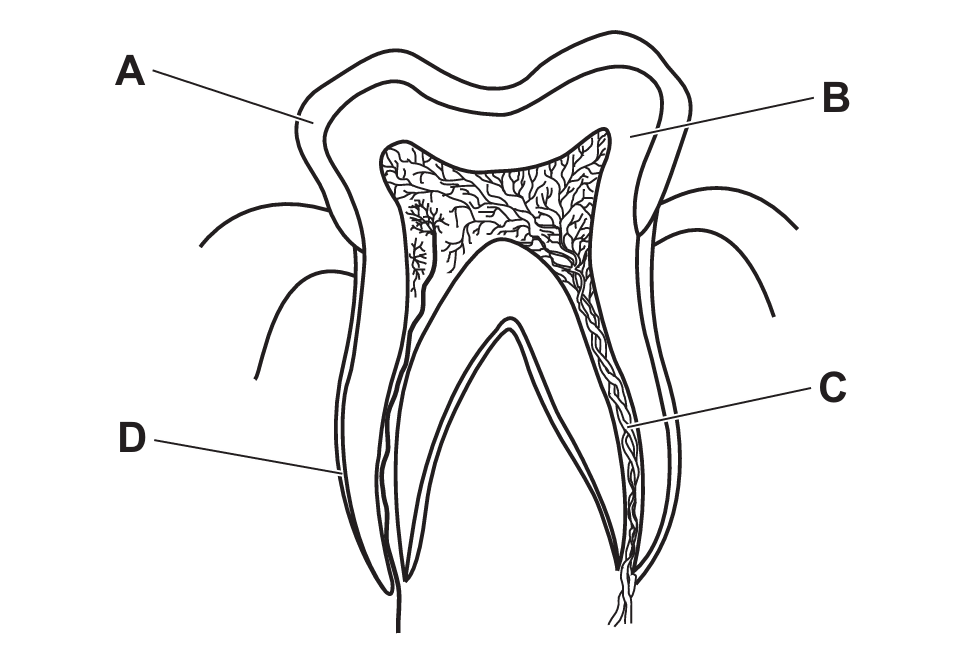 Which letter identifies the dentine?