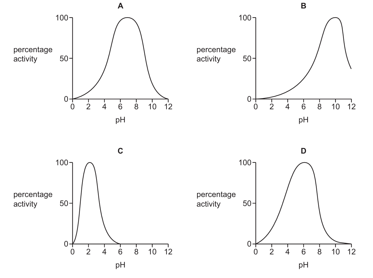 The human stomach maintains a highly acidic environment, typically between pH \( 1.5 \) and \( 3.0 \), due to the secretion of hydrochloric acid. Digestive enzymes have an optimal pH at which their activity is highest. Examining the provided graphs, Enzyme C shows peak activity at approximately pH \( 1 \), which falls directly within the stomach’s acidic range. The other enzymes are optimal at neutral or alkaline pH levels, where they would be far less active or denatured in the stomach. Therefore, Enzyme C is adapted to function in the stomach.