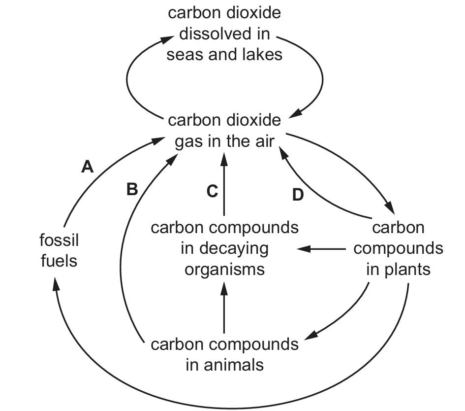 Arrow D shows this flow: it originates from “carbon compounds in plants” and points to “carbon dioxide gas in the air”. The other arrows represent different processes: A shows \( \text{CO}_2 \) dissolving into water, B shows uptake by plants for photosynthesis, and C shows carbon transfer from plants to animals via consumption.