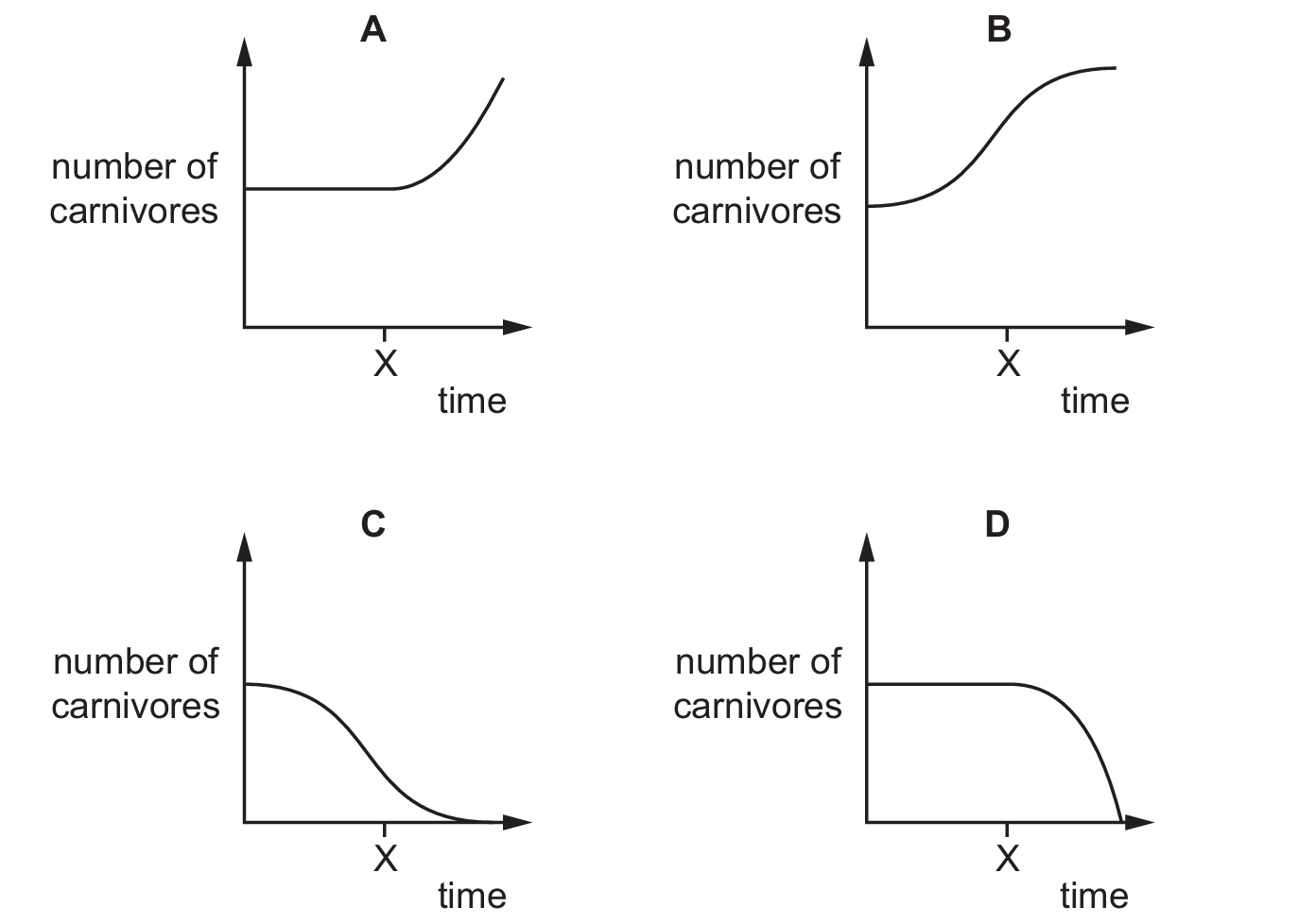 The graphs show the number of carnivores in a habitat over a period of time. At time \(X\), the herbivores in the food chain are removed from the habitat.