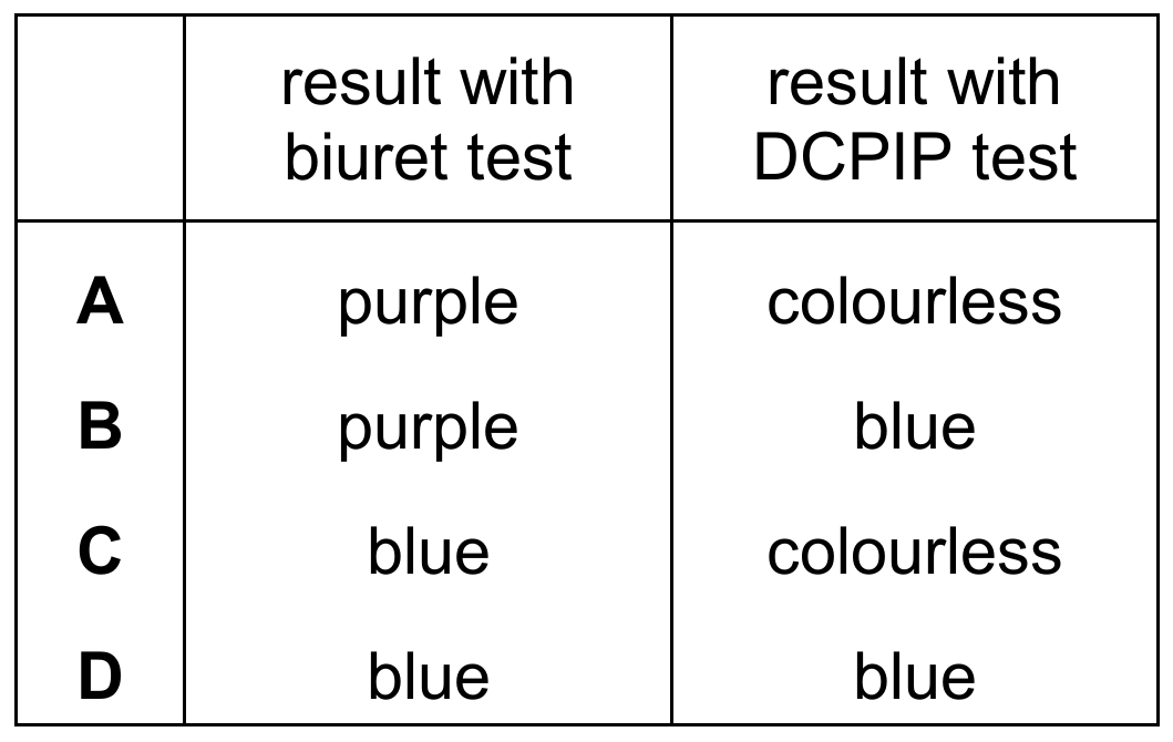 The Biuret test detects proteins. A positive result is indicated by a purple/violet color change (from light blue). The DCPIP test is used for vitamin C (ascorbic acid). Vitamin C reduces blue DCPIP, causing it to become colorless. Since the food contains both protein and vitamin C, the Biuret test should yield a purple color, and the DCPIP test should yield a colorless result. This combination corresponds to row A.
