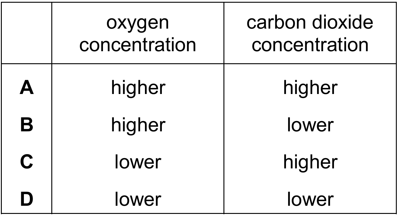 Which row describes the composition of expired air compared to the composition of inspired air?