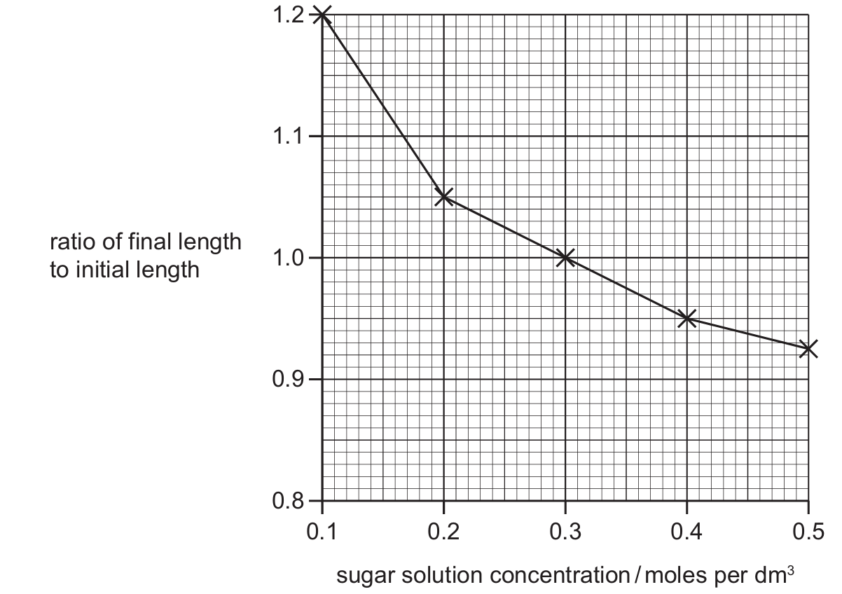Cylinders of potato tissue were placed in sugar solutions of different concentrations and left overnight. The lengths of the potato cylinders were measured before and after they were placed in the sugar solutions.