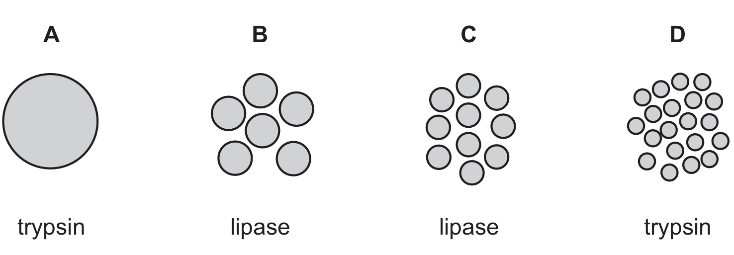 In which combination of oil drop size and enzyme will the oil be digested the fastest?